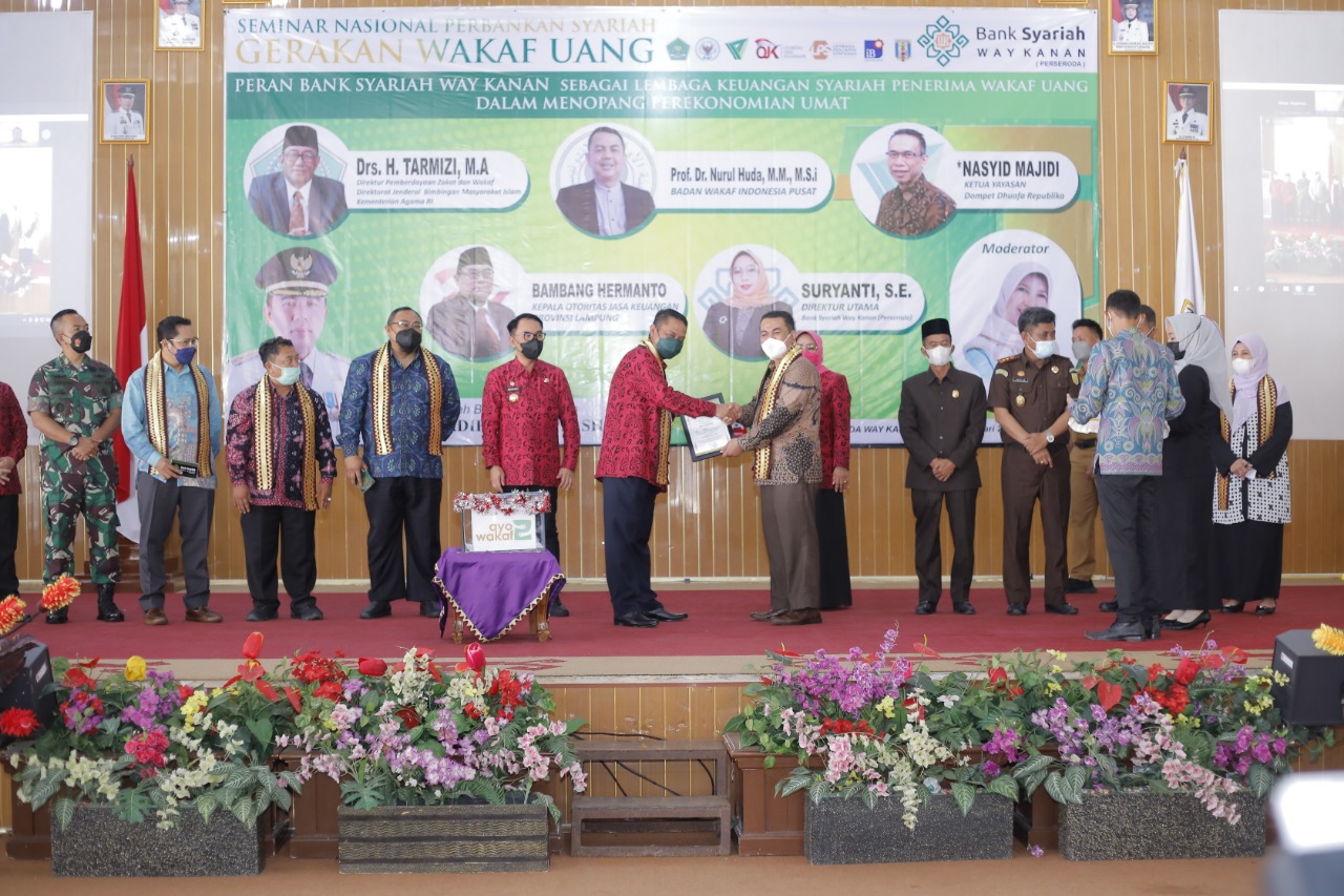 Hal tersebut dikatakan Bupati H. Raden Adipati Surya, S.H.,M.M saat membuka Seminar Nasional Gerakan Wakaf Dalam Rangka Milad Ke-11 PT. BPRS Way Kanan (Perseroda) di GSG Kabupaten Way Kanan, Senin (24/01/2022) yang  dihadiri secara Virtual oleh Direktur Pemberdayaan Zakat dan Wakaf Dirjen Bimbingan Masyarakat Islam Kemenag RI, Drs. H. Tarmizi,  diwakili secara langsung oleh Kasubdit Kelembagaan Zakat dan Wakaf Kemenag RI, Andi Yasri, Kasubdit Pengamanan Aset Wakaf Kemenag RI, Dr. Zaenuri, Pengurus Badan Wakaf Indo Pusat, Prof. Dr. Nurul Huda, M.M.,M.Si, General Manager Fundristinng Dompet Dhuafa, Bobby P. Manulung, Kepala OJK Provinsi Lampung, Bambang Hermanto, Dirut Bank Syariah Way Kanan, Surnai, S.E, Komisaris BPRS Way Kanan, Ir. Kussarwono, M.T, Wakil Bupati Drs. Ali Rahman, M.T, Forum Komunikasi Pimpinan Daerah, Sekretaris Daerah Kabupaten, Saipul, S.Sos.,M.IP, para Staf Ahli Bupati, para Asisten Sekda, Kepala Satuan Kerja Perangkat Daerah, para Kepala Bagian Setdakab, Camat Blambangan Umpu dan Umpu Semenguk,  dan para Tokoh Organisasi Islam.