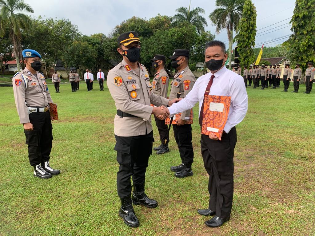 WAY KANAN – Kapolres Way Kanan AKBP Teddy Rachensa memberikan piagam penghargaan kepada 16 (Enam belas) personel Polres Way Kanan yang berprestasi, di lapangan Apel Parama Satwika Polres Way Kanan. Senin (22/08/2022).