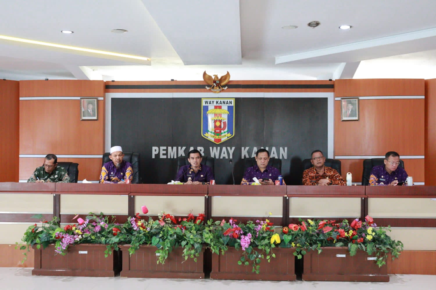 Way Kanan – Penjabat (Pj.) Sekretaris Daerah Kabupaten, Dr. Arie Anthony Thamrin, S.STP., M.IP., CGCAE., CGRE memimpin Rapat Koordinasi Sekretariat Daerah Kabupaten Way Kanan di Ruang Buway Pemuka Pengiran Tuha, Kamis (24/04/2025).